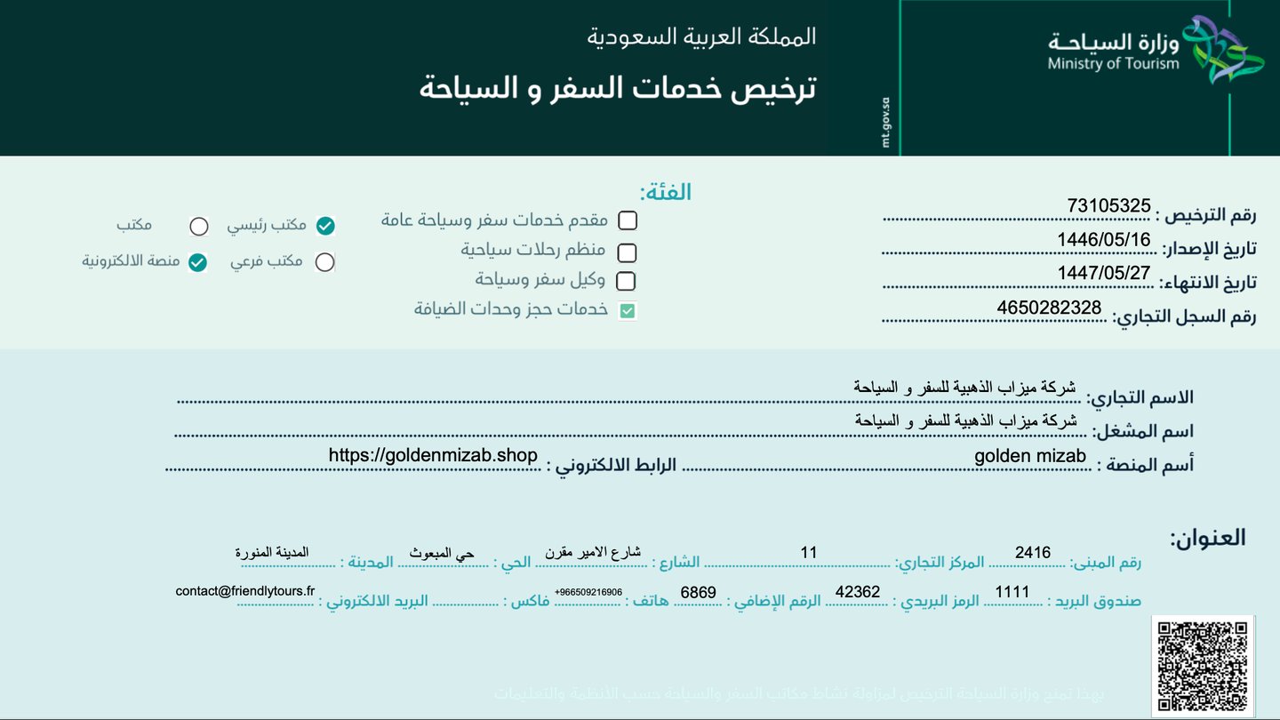 We are GOLDEN MIZAB for Travel and Tourism, based in Al-Madinah Al-Munawwarah, dedicated to providing exceptional travel and tourism services.